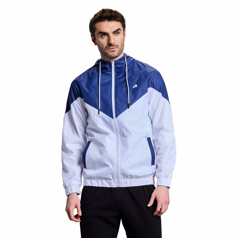 100% poly woven fabric, lightweight design, stylish contrast panelling, hoodie with drawcord
