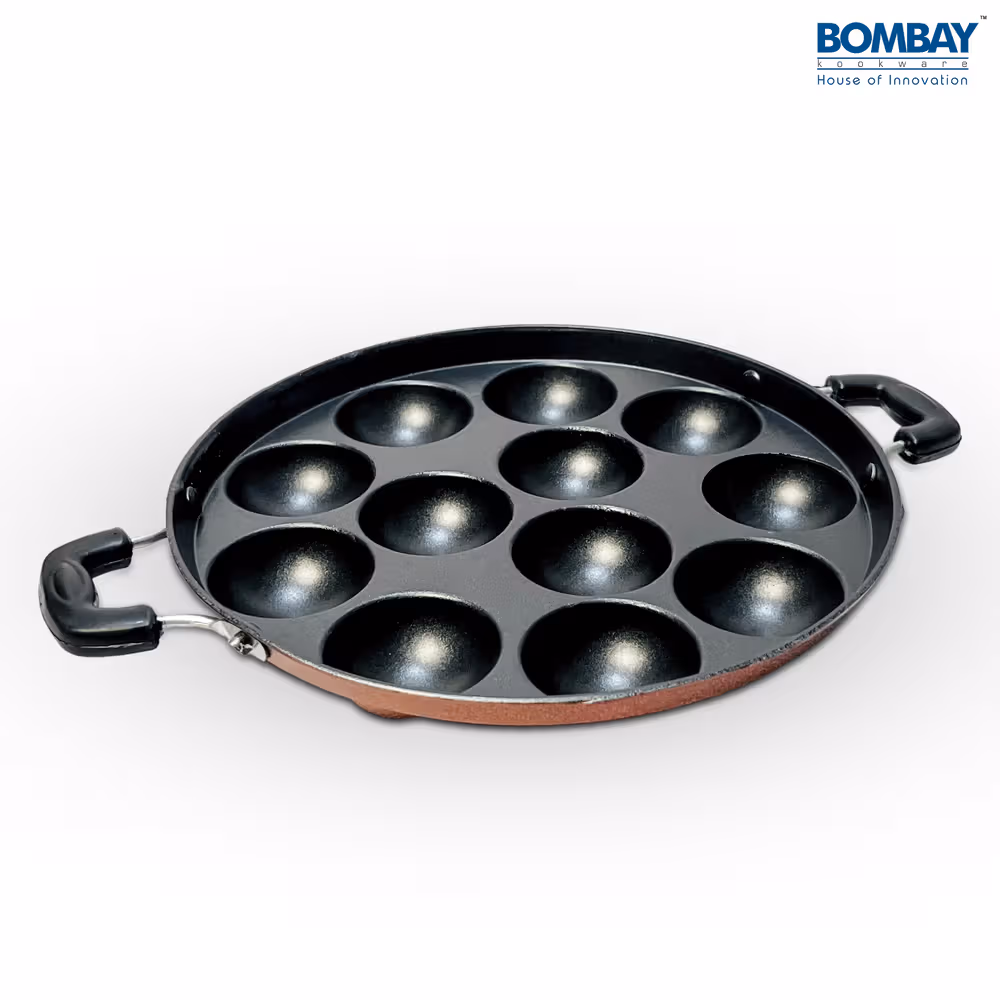 12-cavity design for multiple appams, non-stick coating for easy release, includes a steel lid for versatile cooking, bakelite handle for safe grip