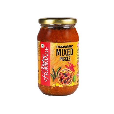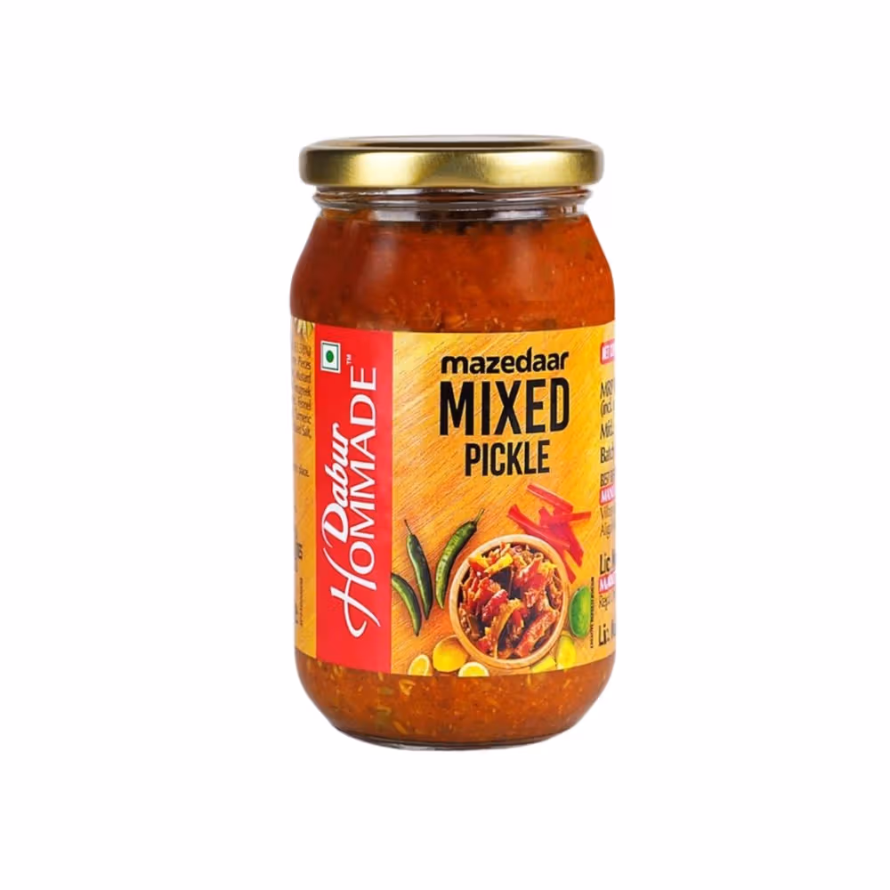 Mixed Fruits & Vegetable Pieces (66.2%) [Mango Pieces (26.54%), Carrot Pieces (18.74%), Lime Pieces (12.49%), Green Chilli Pieces (7.81%), Dela fruit], Water, Spices & Condiments (6.21%) [Fenugreek Powder, Fenugreek Whole, Fennel Whole, Mustard Powder, Fennel Powder, Chilli Powder, Coriander Powder, Black Cumin (Kalonji), Turmeric Powder, Capsicum Extract, Paprika Extract, Asafoetida), Iodised Salt, Acidity Regulator (INS 260), Mustard Oil and Preservative (INS 211)