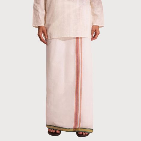 Traditional woven pattern with zari border, Premium cotton blend construction, Perfect for festive occasions