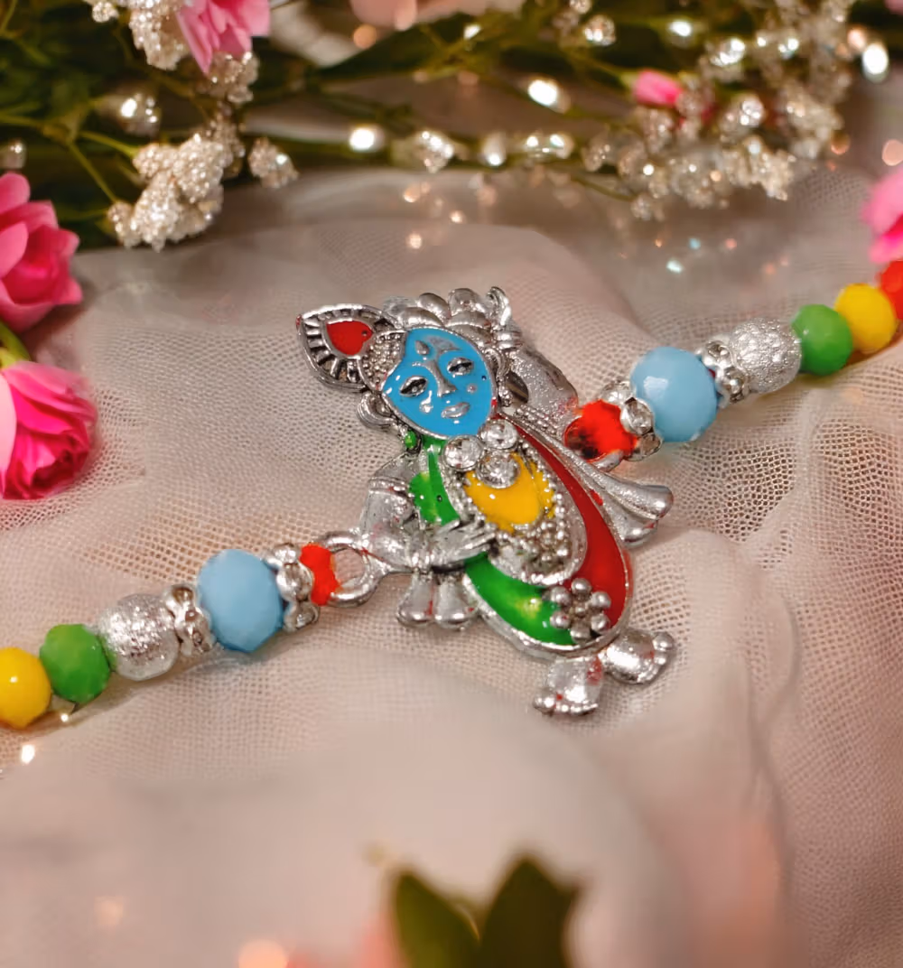 Unique Krishna pendant design, made with 925 silver, vibrant multicolour beads, perfect for festive occasions