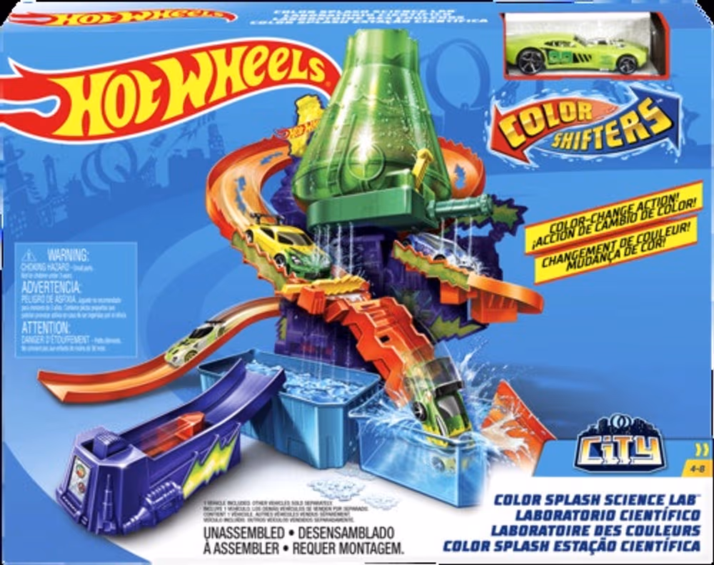 Three different color-change zones, Connects to existing Hot Wheels tracks, includes one color shifters car, interactive rescue missions