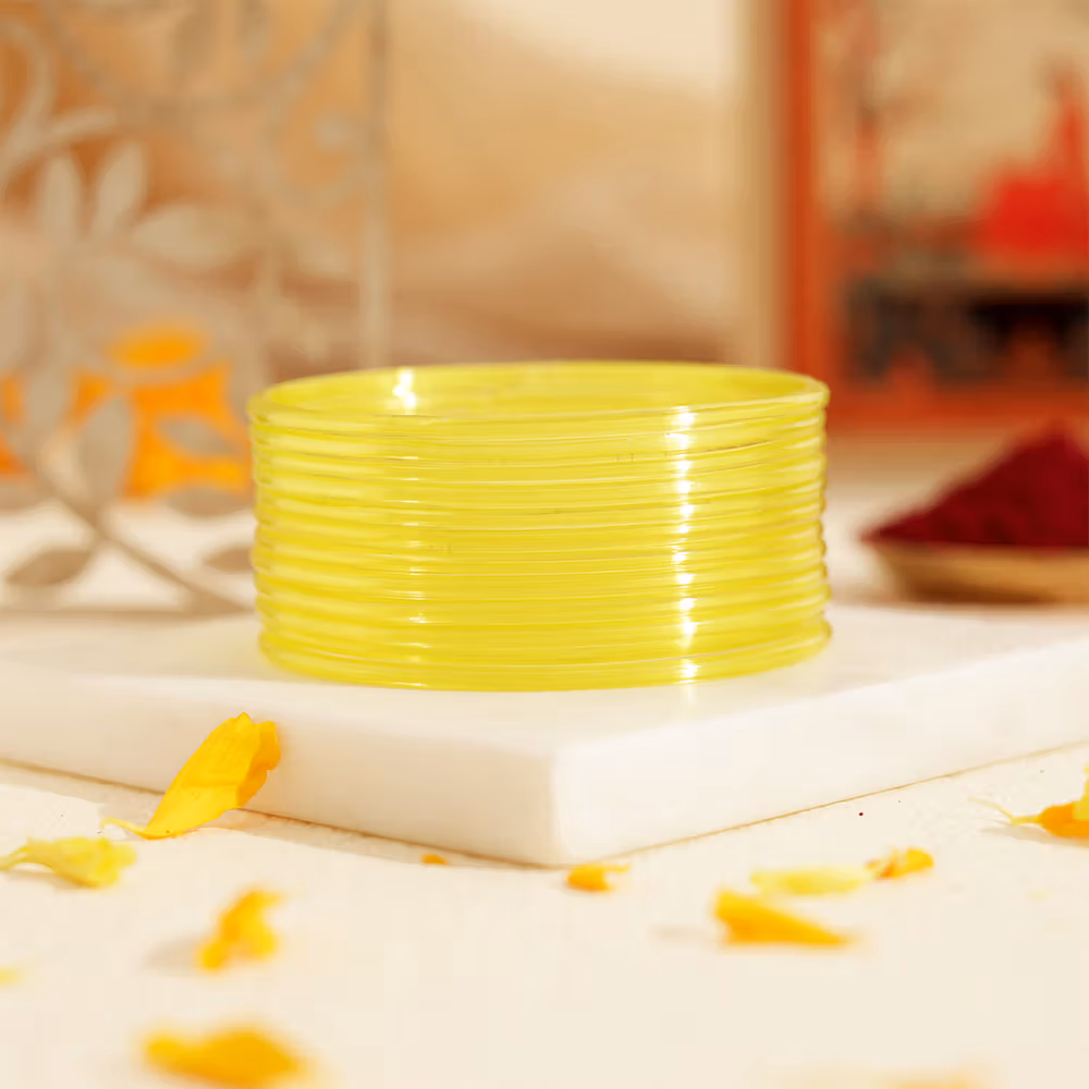 Elegant yellow glass bangles, perfect for festivals and weddings, lightweight and beautiful, adds a touch of joy to your look