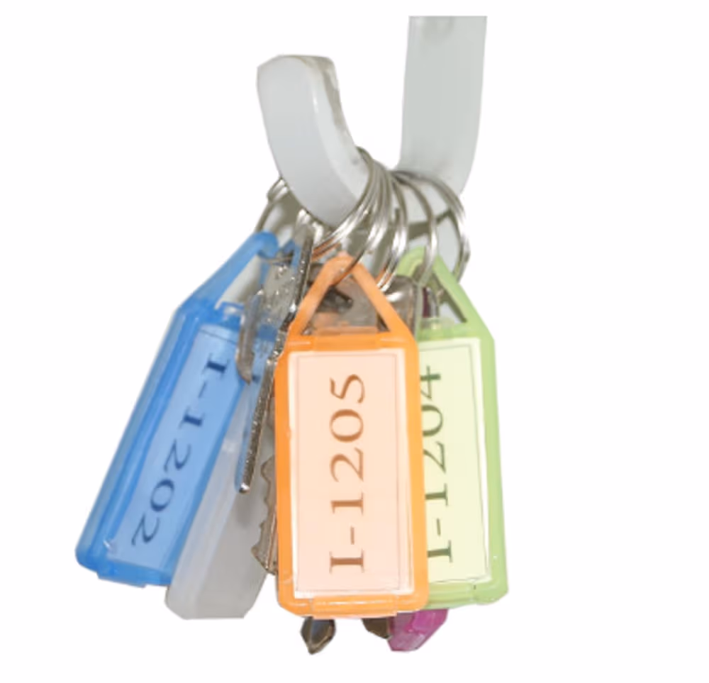 Color-coded for easy identification, lightweight and durable plastic, writable labels for customization, includes split ring for attachment
