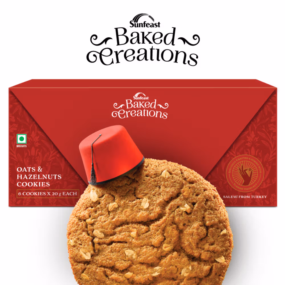 Sugar, Maida (Refined Wheat Flour), Oats Flour (12.8%), Hydrogenated Vegetable Oil, Raisins, Rolled Oats (5.5%), Hazelnut Bits (4.3%) (of which 0.1% Turkish Hazelnut), Butter, Invert Syrup, Orange Peels, Milk Solids, Raising Agents (INS 500(ii), INS 503(ii), INS 450(i)), Refined Palm Oil, Iodized Salt, Artificial Flavouring Substances (Vanilla), Emulsifier (Mono and Diglycerides of Fatty Acids from Palm Oil)