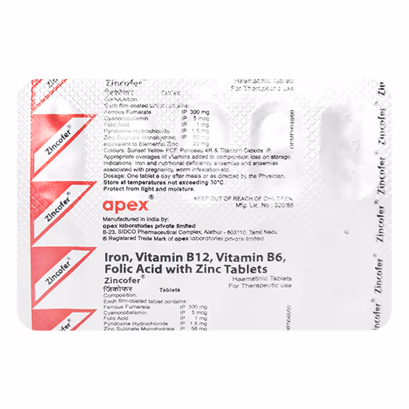 Cyanocobalamin (5mcg), Elemental Zinc (20mg), Ferrous Fumarate (300mg), Folic Acid (1mg), Vitamin B6 / Pyridoxine (1.5mg)